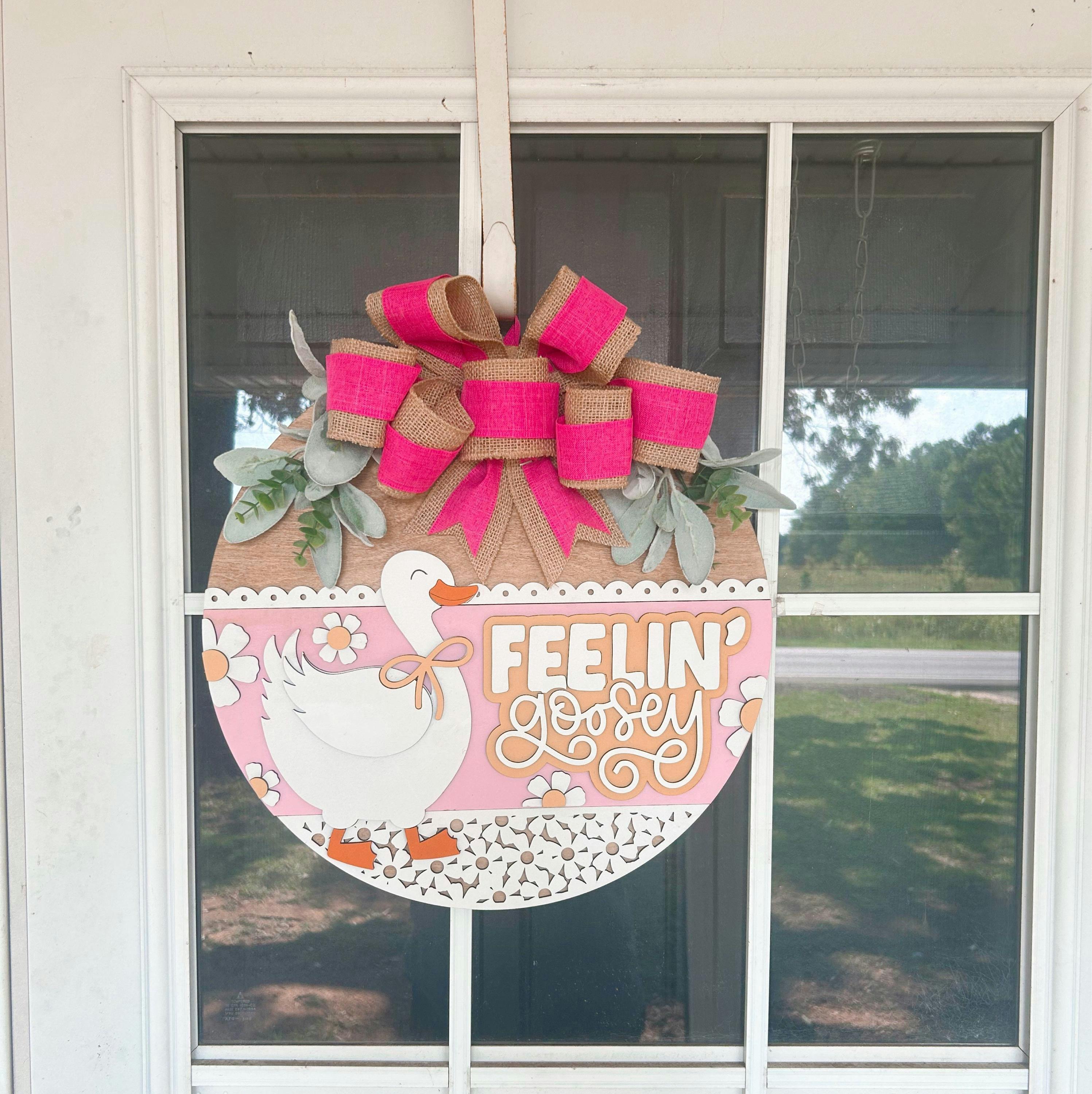 This handcrafted round door sign features a cheeky goose, floral accents, and the phrase “Feelin’ Goosey” in bold, retro-style lettering. Finished with a layered wooden design, faux greenery, and a bright pink farmhouse bow, it’s guaranteed to get honks of approval from all your guests.