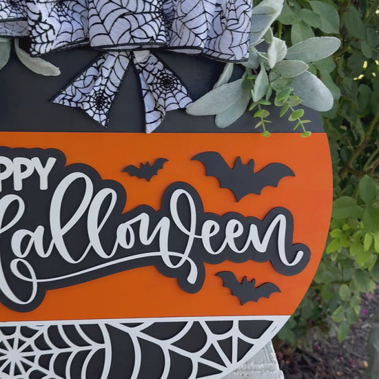 Welcome trick-or-treaters in style with our Happy Halloween Door Sign! Featuring bold layered lettering, spooky bats, and a web design, this handmade sign perfectly blends modern farmhouse charm with festive Halloween spirit. The black-and-white spiderweb bow and greenery add a touch of elegance to your seasonal décor.