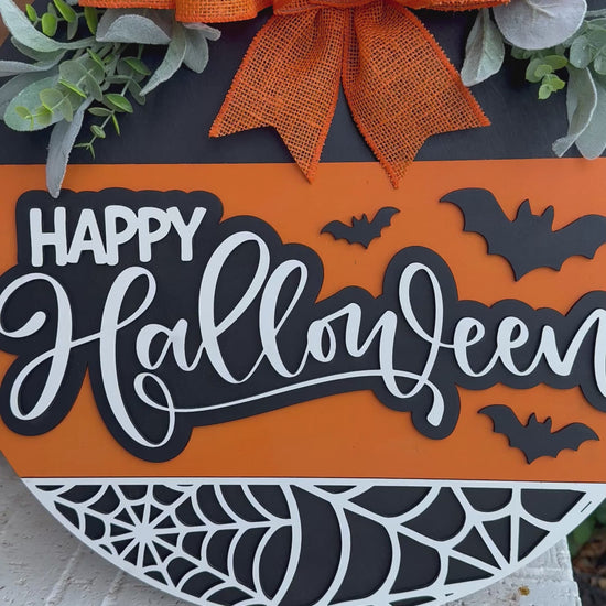 Welcome spooky season in style with this layered "Happy Halloween" door sign! With bats, spiderwebs, and bold Halloween colors, it’s a festive statement piece for your front door or entryway.