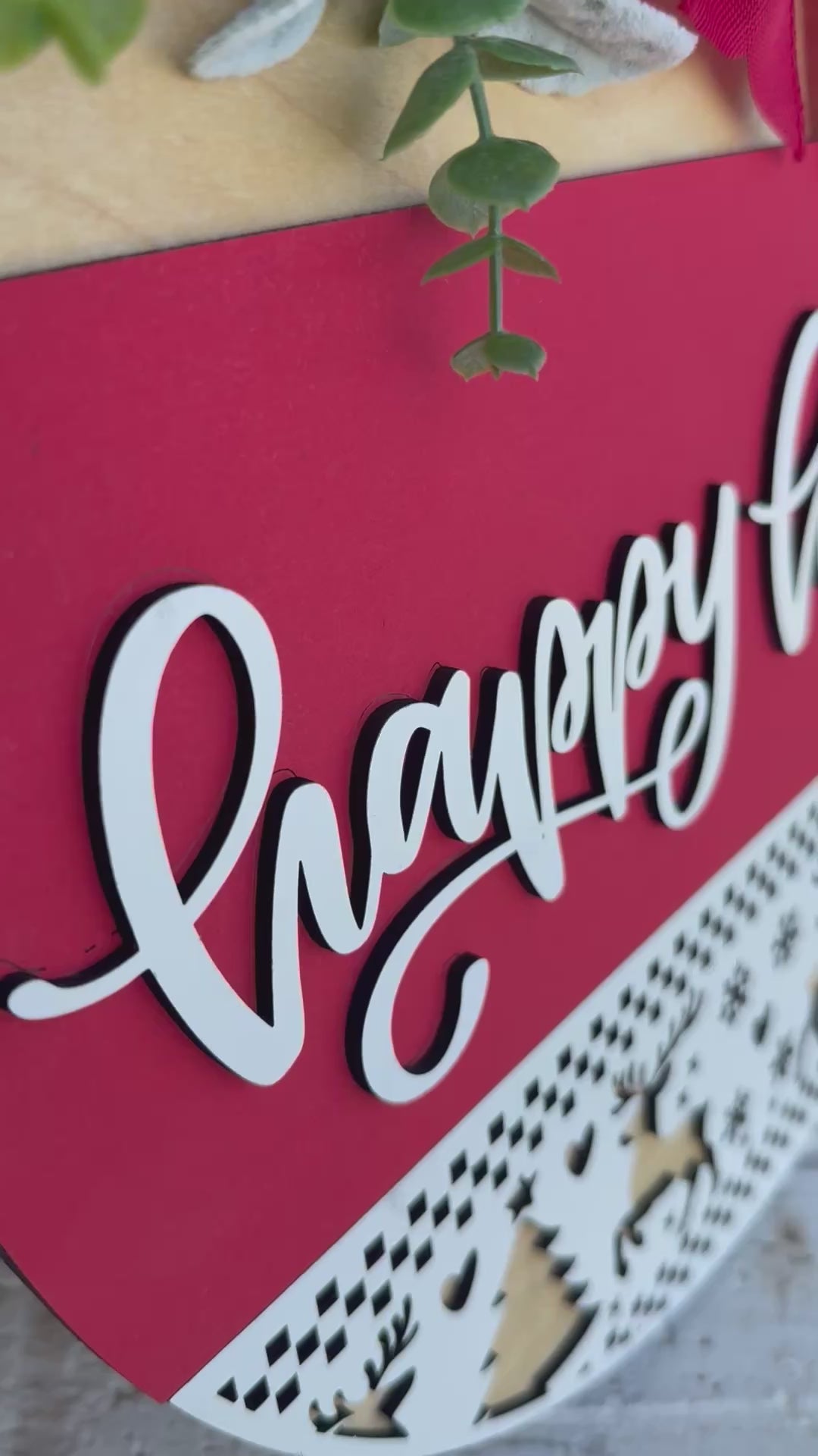 Celebrate the season with this Happy Holidays Door Sign, a festive blend of rustic farmhouse style and cozy holiday cheer. The bold red backdrop is paired with elegant white script and a Scandinavian-inspired cutout pattern featuring reindeer, trees, and hearts for that timeless Christmas feel.