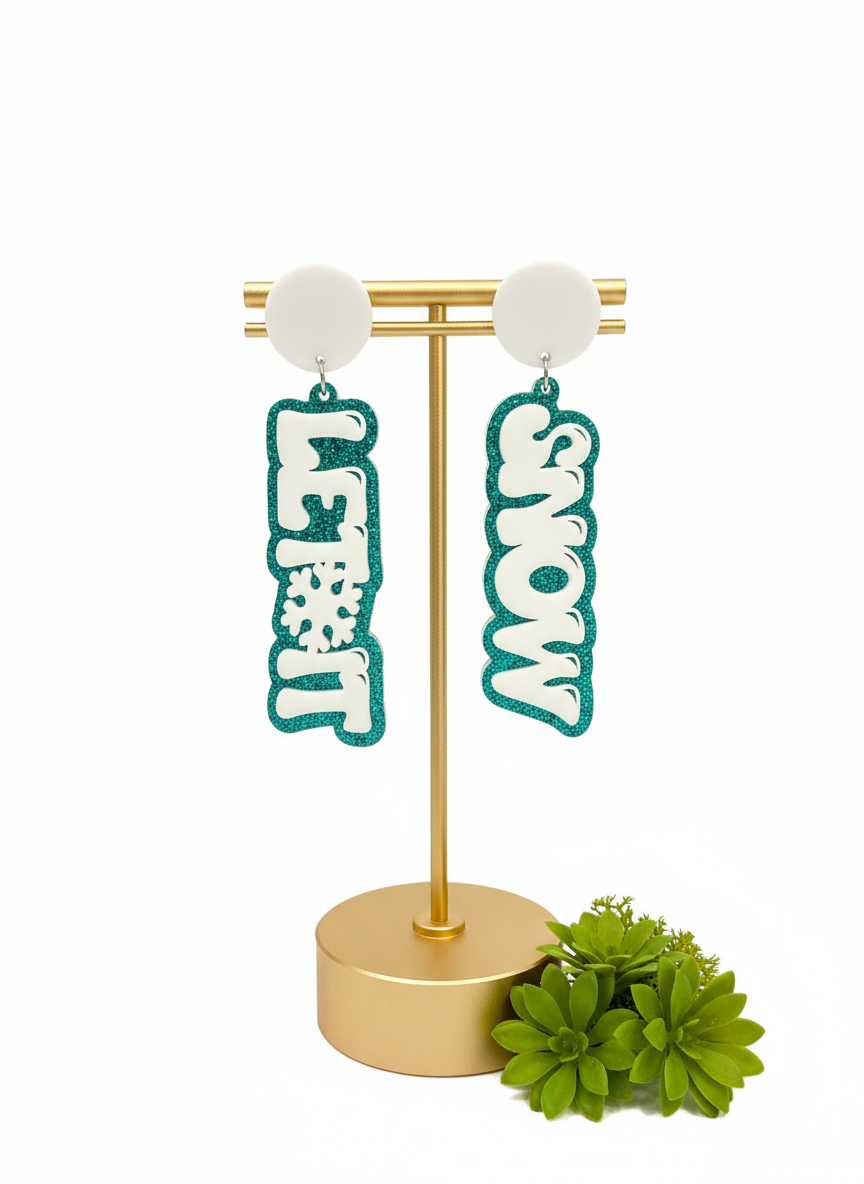 Let it snow, let it sparkle, and let your winter wardrobe actually pop this season! These festive “LET IT SNOW” acrylic statement earrings bring frosty fun with a bold icy teal glitter base and crisp white lettering — complete with a cute snowflake cutout for extra seasonal charm.
