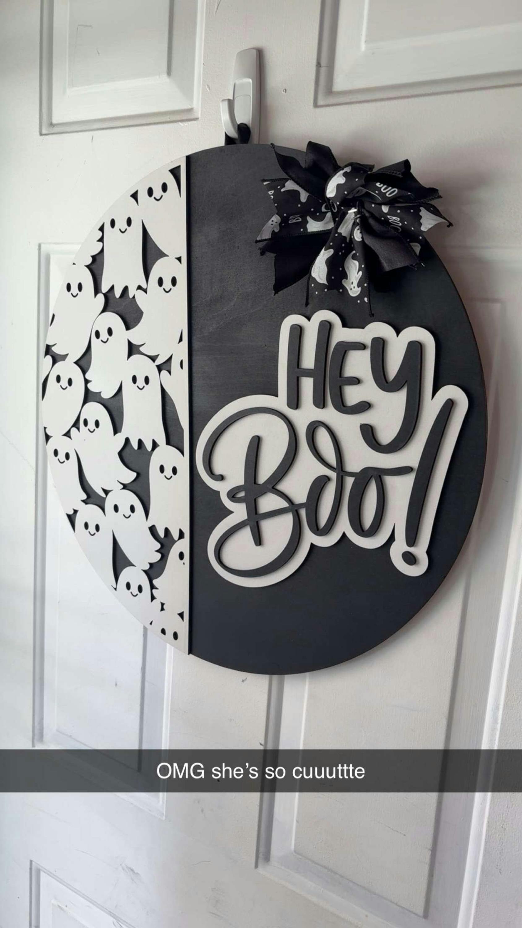 Hey Boo Halloween Door Sign – Laser Cut, Hand Painted Black & White Ghost Wreath with Bow, Farmhouse Fall Porch Decor, Outdoor Safe Hanger