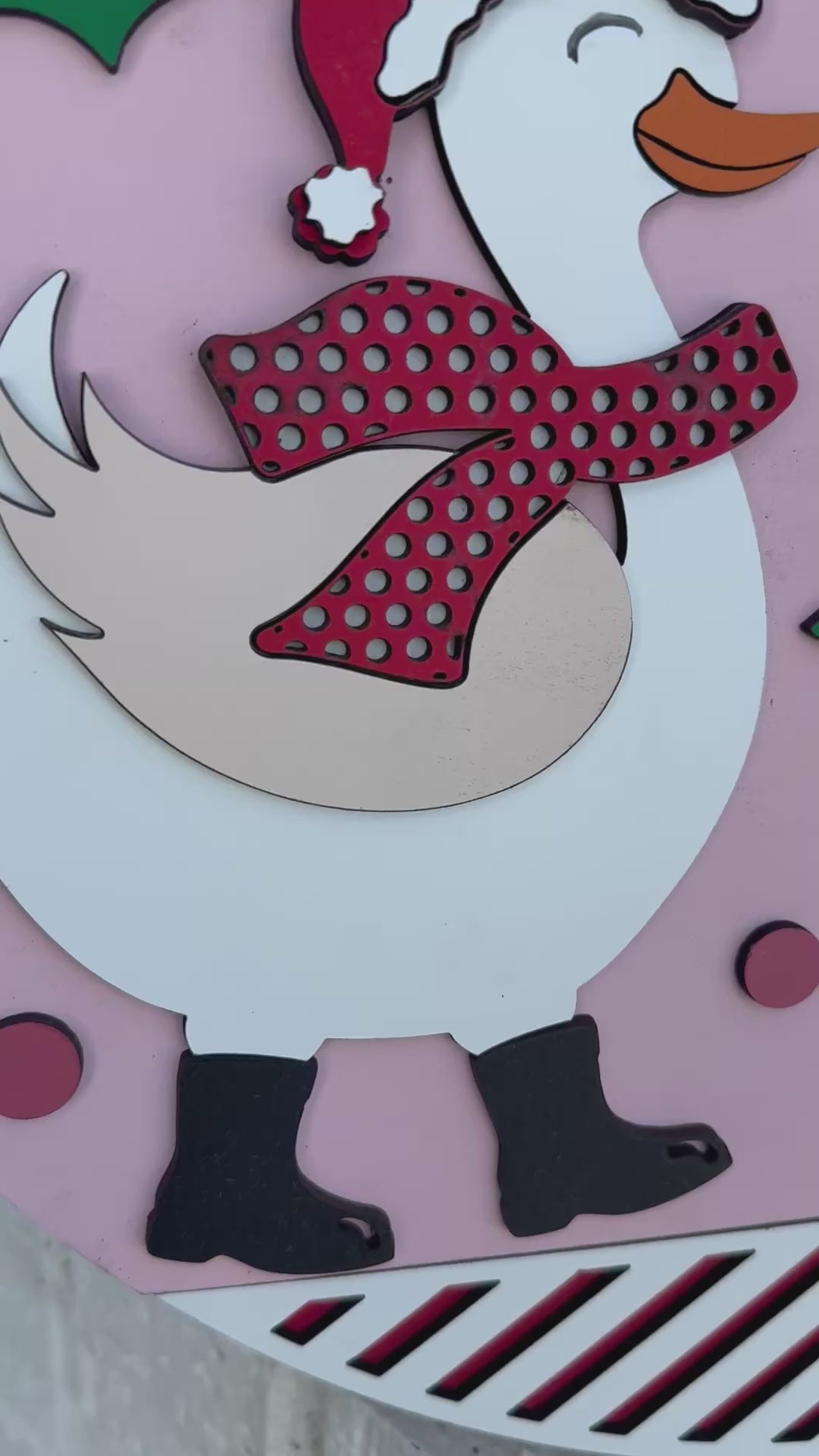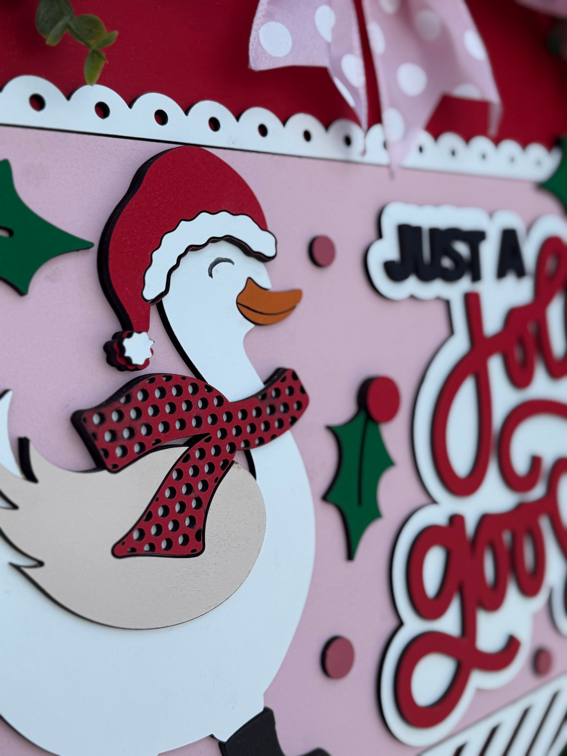 Bring festive cheer to your holiday season with our “Just a Jolly Goose” Christmas door sign! Featuring a layered wood design of a jolly goose in winter boots and scarf, surrounded by holly and holiday accents, this whimsical sign is perfect for your front door, entryway, or mantel. Handcrafted with care, each piece is laser cut, hand-painted, and finished with greenery and a festive bow. Available in multiple sizes to fit your space, it makes a joyful addition to farmhouse décor or a fun holiday gift for goose lovers.