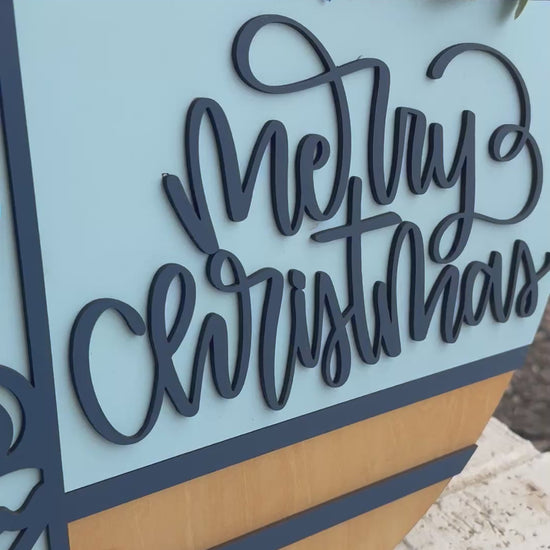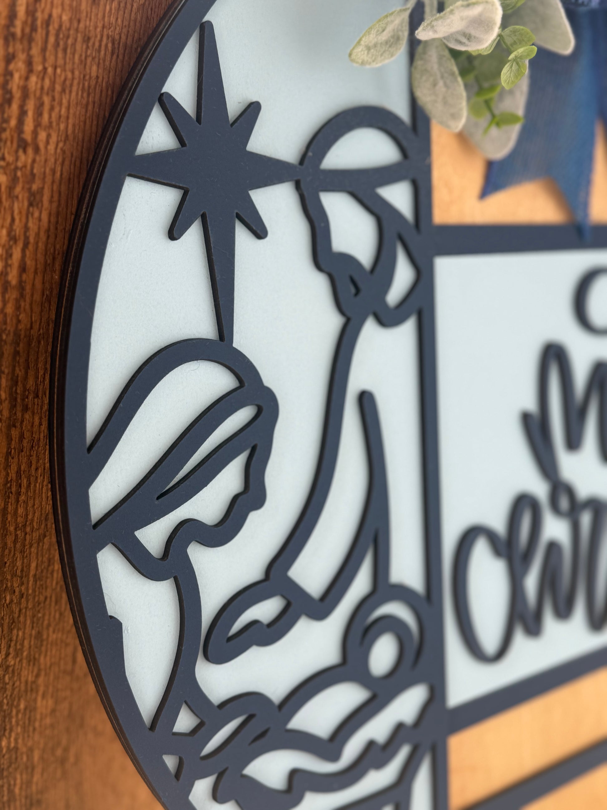 This handmade layered wood sign beautifully captures the true meaning of the season — featuring a minimalist nativity silhouette of Mary, Joseph, and baby Jesus beside elegant “Merry Christmas” script lettering. The design combines black, white, and natural wood tones with a snowflake bow and greenery for a modern farmhouse look that blends perfectly with your holiday décor.