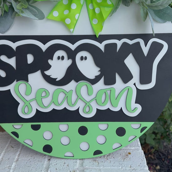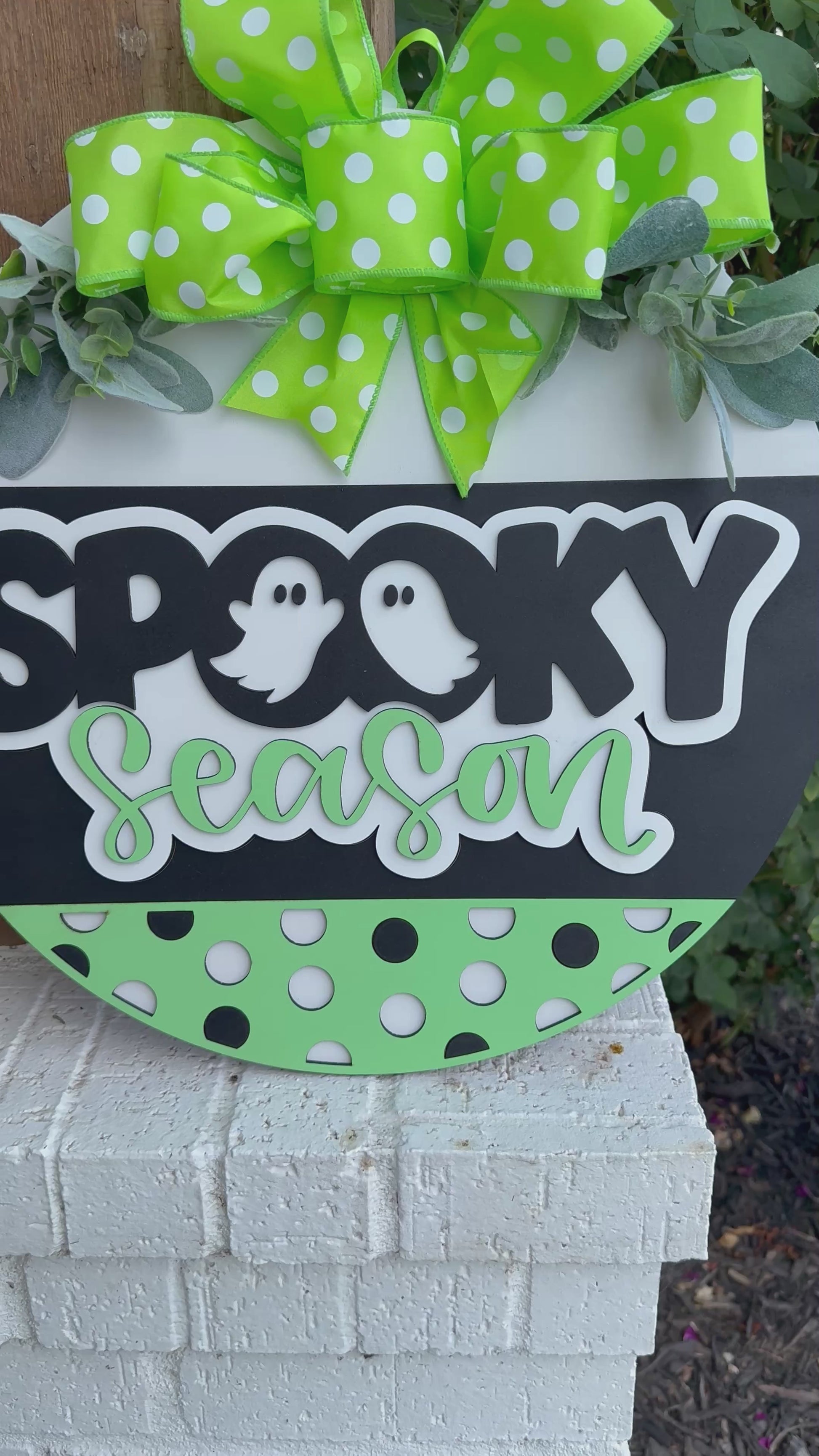 Celebrate the spookiest time of the year with this Spooky Season Ghosts Door Sign! 🎃👻 Crafted from layered wood and laser-cut for precision, this Halloween wreath-style sign features adorable white ghosts, bold lettering, and a stylish black and green polka-dot design. Finished with greenery and a bright green bow, it’s the perfect mix of farmhouse charm and Halloween fun.