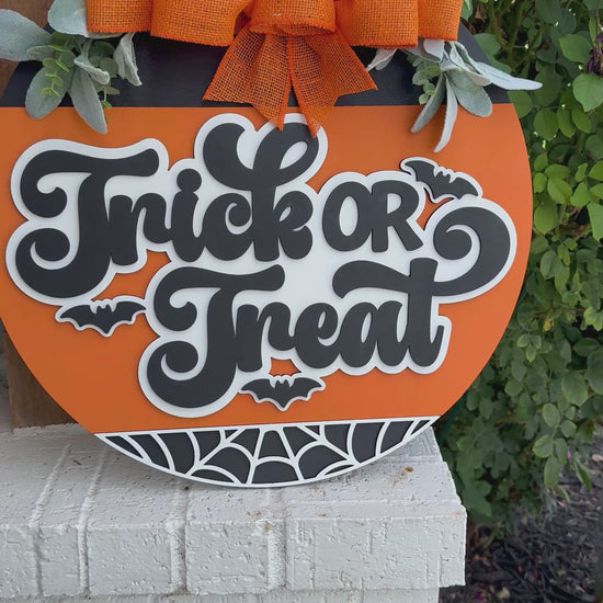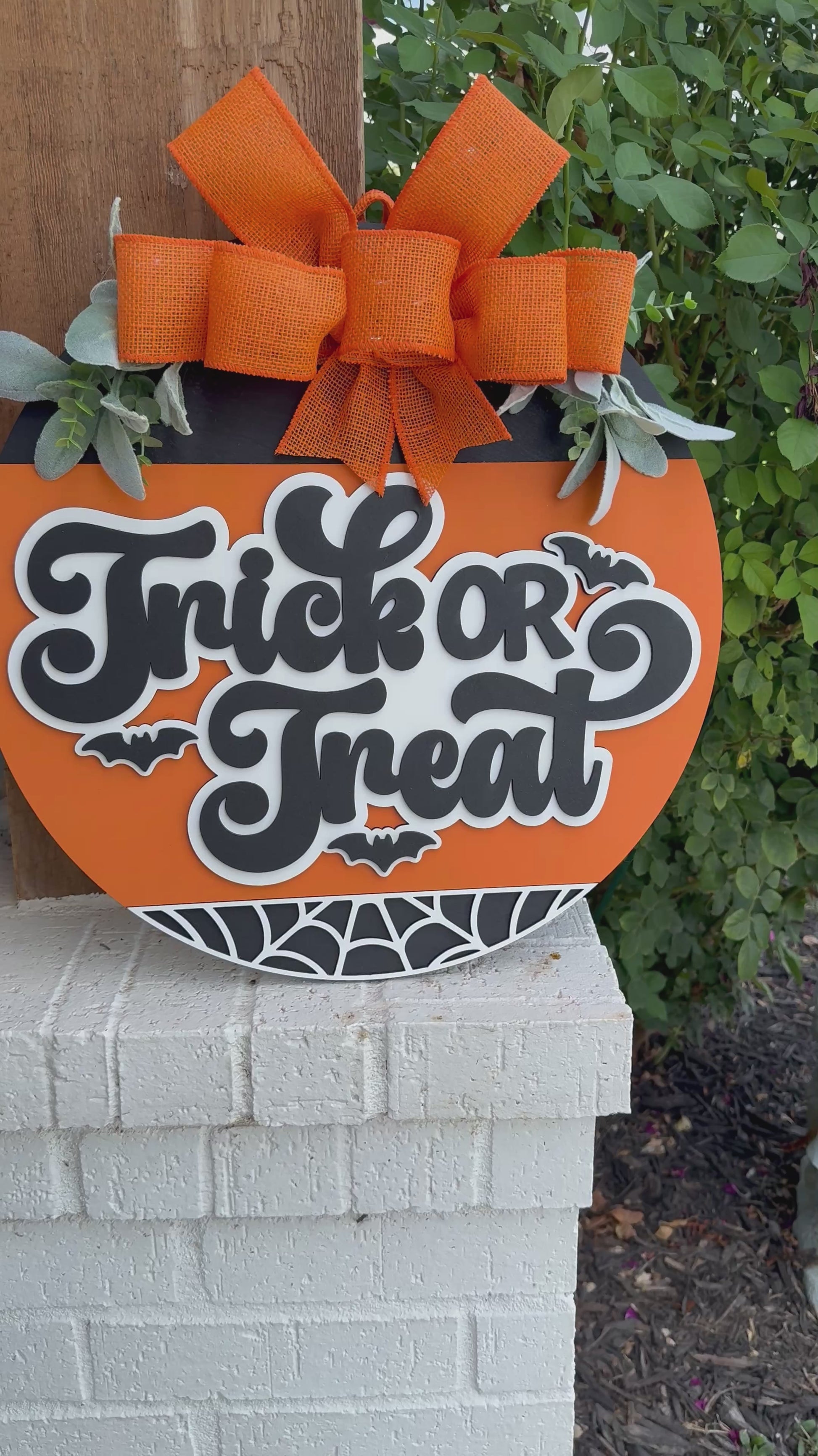 Get your porch ready for spooky season with this bold Trick or Treat Halloween Door Sign! ππΈοΈ Featuring vibrant orange and black colors, swirling script lettering, playful bats, and a spider web design, this handmade door hanger is the perfect way to welcome trick-or-treaters. Each piece is laser cut, hand-painted, and layered in 3D for stunning depth and detail. Finished with eucalyptus greenery and a festive orange bow, it makes a statement on any front door.