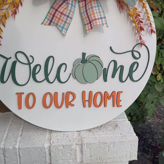 Welcome guests to your home with our beautifully handcrafted Welcome To Our Home Pumpkin Door Sign. Made with love in Fort Worth, Texas, this charming sign is the perfect way to add a touch of warmth and hospitality to your front door.